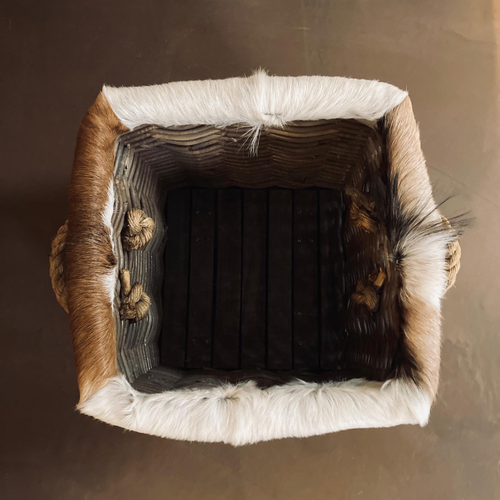 Panier rustique, en bois et poil de vachette.