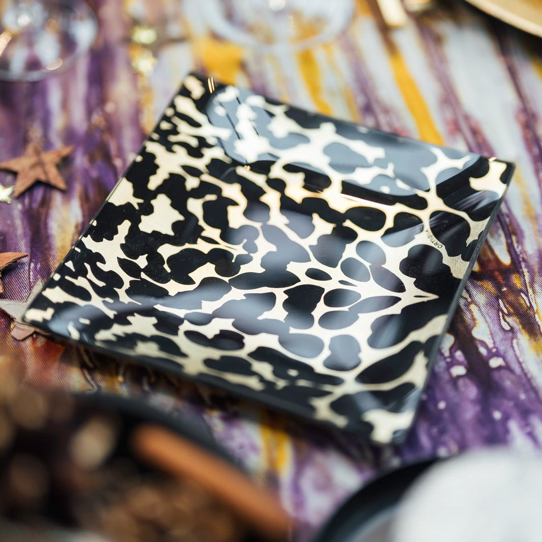 Plateau carré, en verre imprimé et feuille d'or, pour apporter une touche animale à votre intérieur.